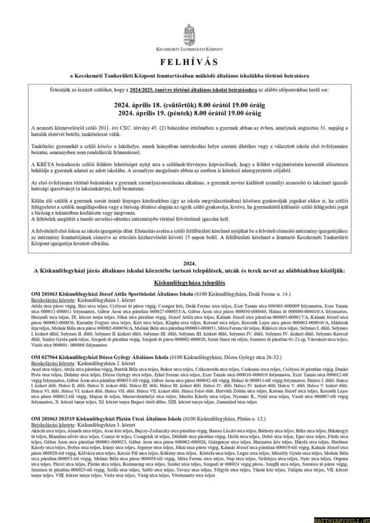 FELHÍVÁS a Kecskeméti Tankerületi Központ fenntartásában működő általános iskolákba történő beíratásra Közzétéve 2024-03-18 , Fekete Imre