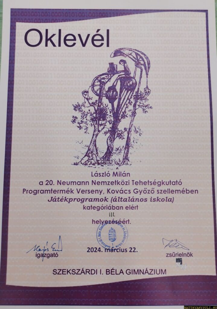A magyar számítástechnika egyik alapítója, Kovács Győző szellemében meghirdetett informatika versenyre László Milán 8.z osztályos tanuló készített egy pályamunkát, és a zsűri értékelése alapján behívták a döntőbe, amelynek időpontja 2024. március 21-22. volt.